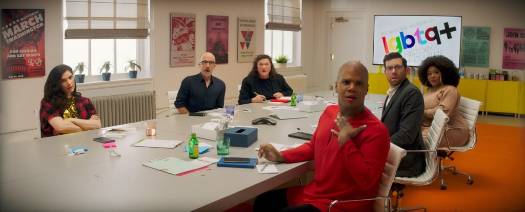 In the background of the film, Bobby is the head of building and curating the New York LGBTQ museum. He’s surrounded by a diverse group of members from the community. Dot Marie Jones is holding it down for the lesbians, the irascible Jim Rash is making sure bi voices are heard. Ts Madison and Eve Lindley are holding it down for the trans girls and Wanda (the ever fashionable Miss Lawrence) is the nonbinary angel they were meant to be.